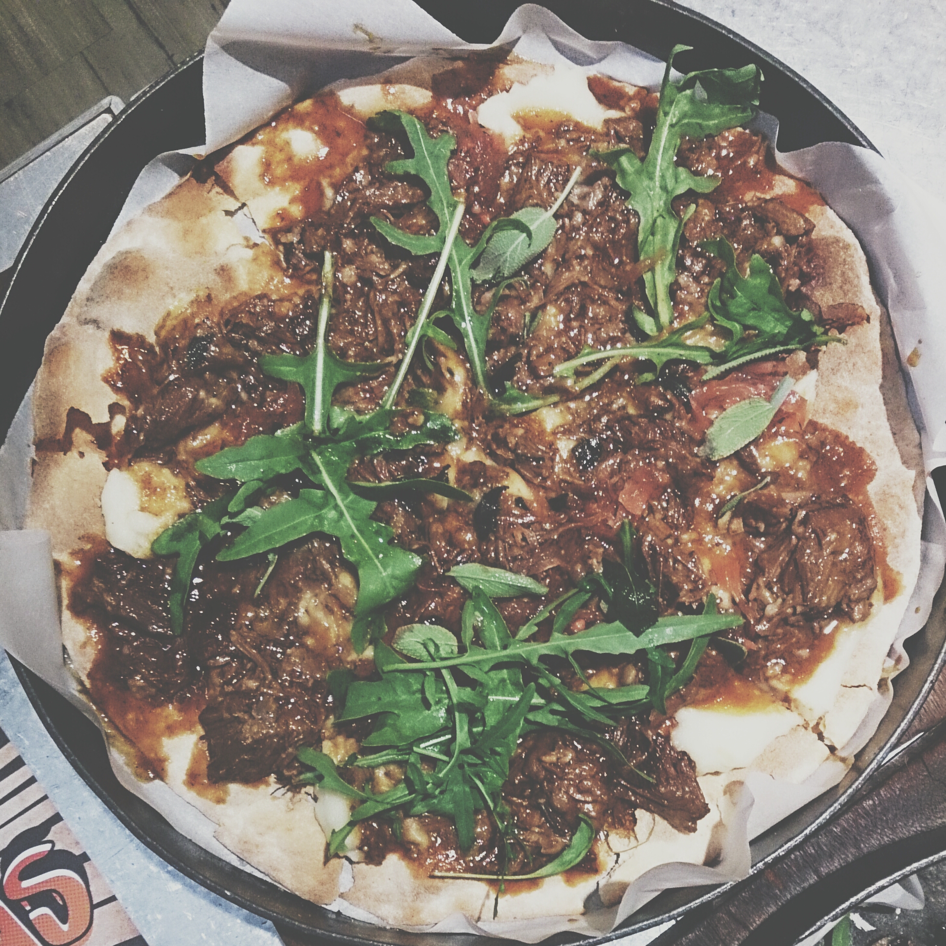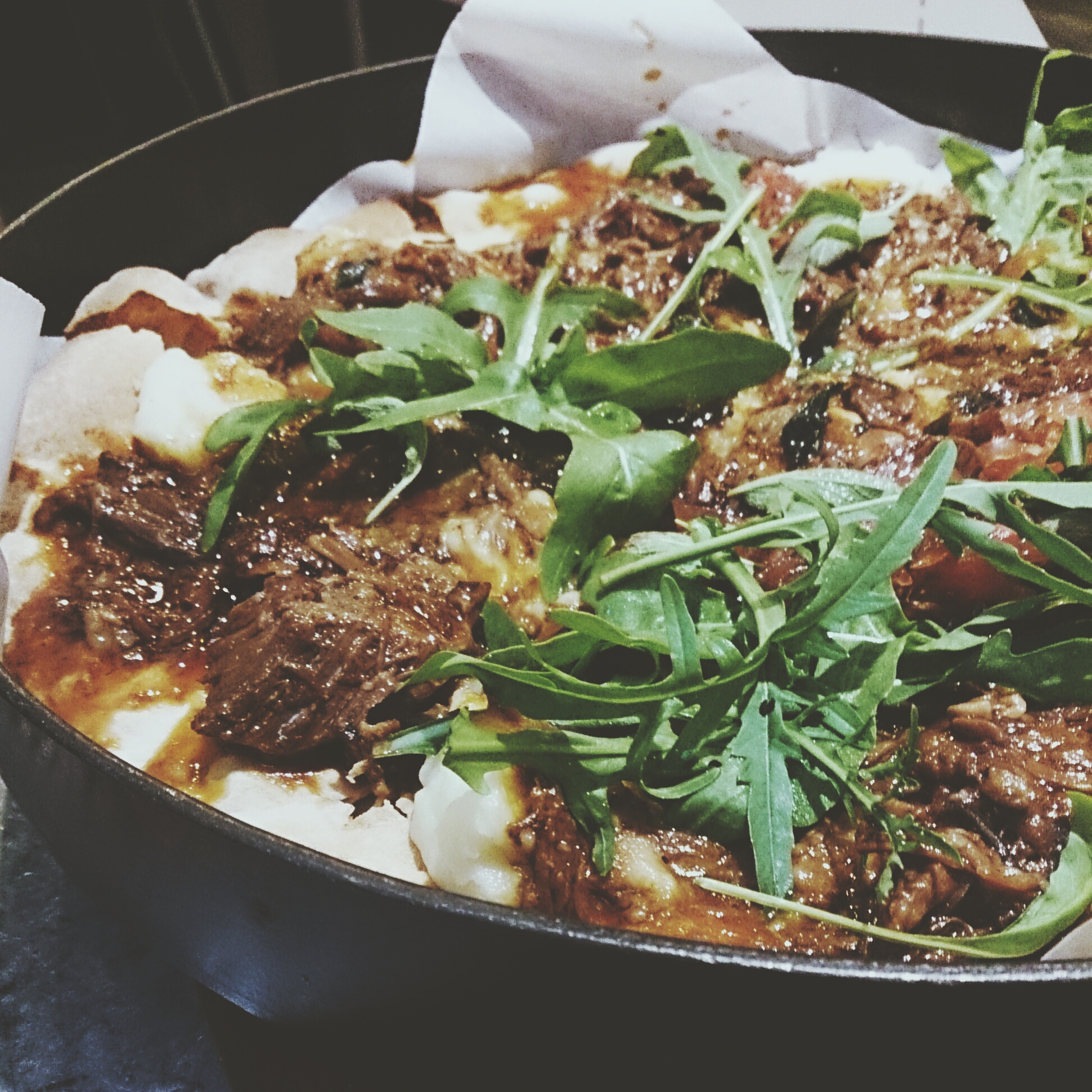 Generous chunks of beef over a bed of mash and topped with a handful of rocked salad; this was to become the ultimate comfort food for our table. Think bangers and mash meets pizza crust, and you’re almost there. 😀