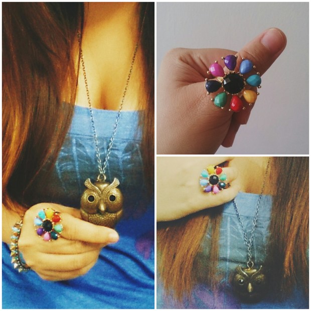 I wanted my last pick to be a fun piece, and this multi-coloured Petal Flower Ring really hit the spot. Them chunky petals remind me of fat gum drops. 😀 I didn’t really have a theme for this one, so the getup here is kind of haphazard. But hey, there’s no rule for mixing and matching! 😛