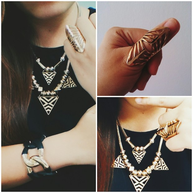 The sharp lines on my Cut Out Armour Ring gave it an edgy feel, so it made sense to pair it with equally bold pieces. Layered it with my F21 necklace and bracelet and set them against my black laser cut sleeve dress. Great if you wanna pull off the formal look at work. 😀