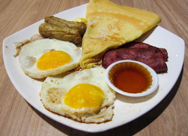 Both of us had Charlie’s All-Time Favourite, the most comprehensive Western breakfast set with juicy chicken chipolatas , turkey ham and 2 sunny side ups, served with crêpe, pancake or toasted foccacia. There are other choices like English and American, among others, albeit with fewer items on the plate.