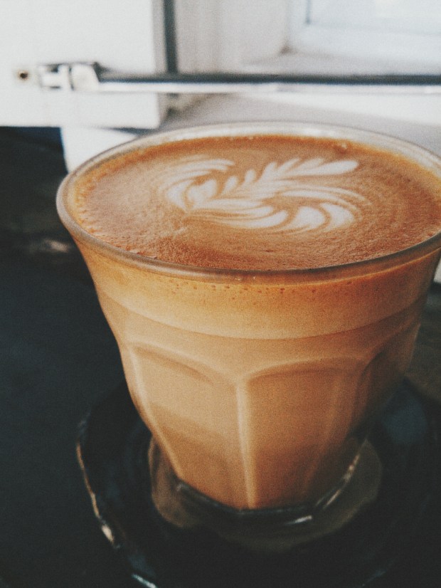 Its grey exterior, striped steps and rustic wooden furniture punctuated by little pots of vibrant hued flowers signal aesthetic taste. The cafe’s layout has its quirks, too, with an elongated table occupying the interior (as opposed to separate booths) and a smattering of high and low tables outside. There’s even a spot by the window to look in and receive your coffee – no, I’m not kidding.