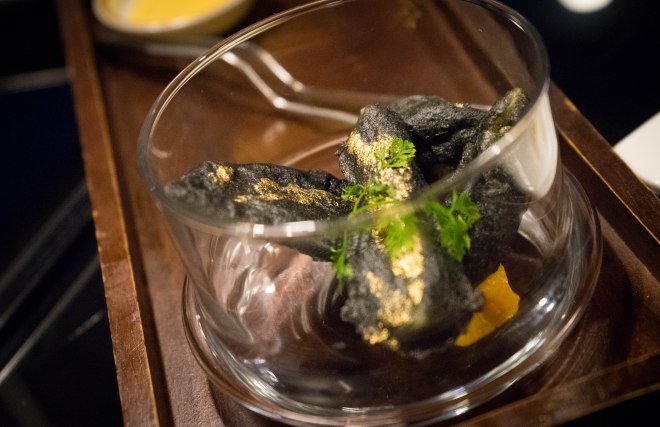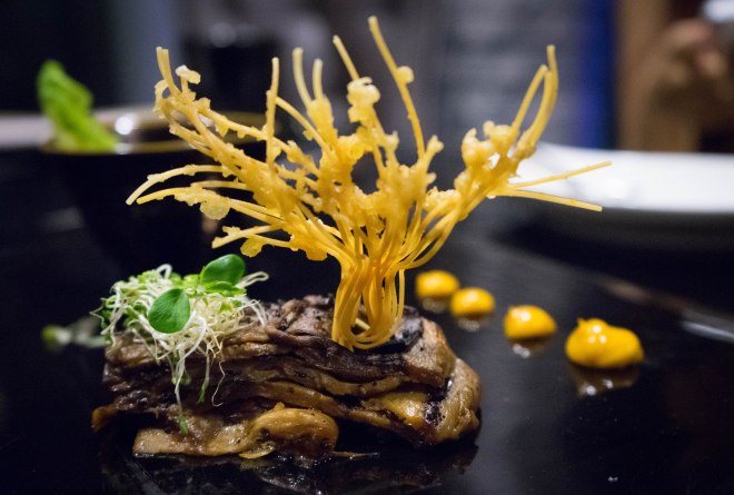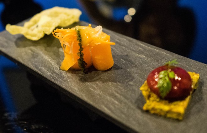 Most mind boggling of them all has got to be the Carrot Sashimi; the texture and taste is uncannily similar to salmon, and can even fool the most discerning of palates. The cracker with wasabi is another play on textures and flavours, while we were told to consume the raspberry sphere in one bite, and for good reason too, as the flavour simply exploded in our mouths!