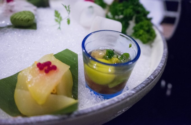 Picking up from the starter, Joie’s Vegetable Sashimi on Ice combines the elevated plating and techniques of Japanese cuisine with fresh fruit and vegetables, including carrot, coconut, kongjac, aloe vera, and pear. There’s even a shooter of Quail Egg with chopped vegetables which, once you get past the initial strangeness of it, yields a combination of smooth saltiness with the delightfully crunchy textures of the vegetables. Interesting!
