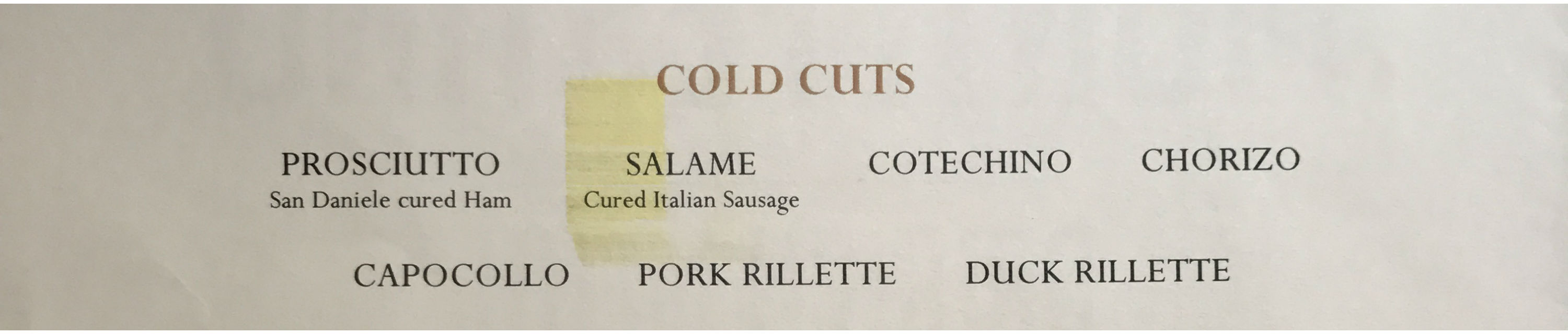 On the Cold Cuts, we were treated to a platter of prosciutto (San Daniele cured ham), salame (cured Italian sausage), cotechino, chorizo, capocollo, pork rillette, and duck rillette.