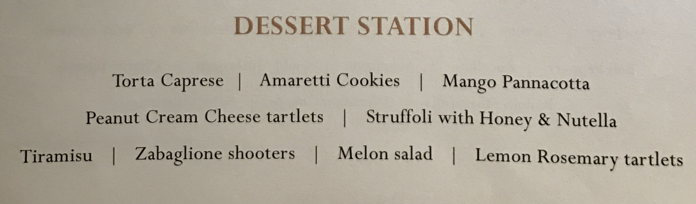 To round up your meal, Monti Festino boasts a variety of desserts, from the typical fruit salads to delicate cakes. My personal favourites were the Zabaglione Shooters and Lemon Rosemary Tartlets.