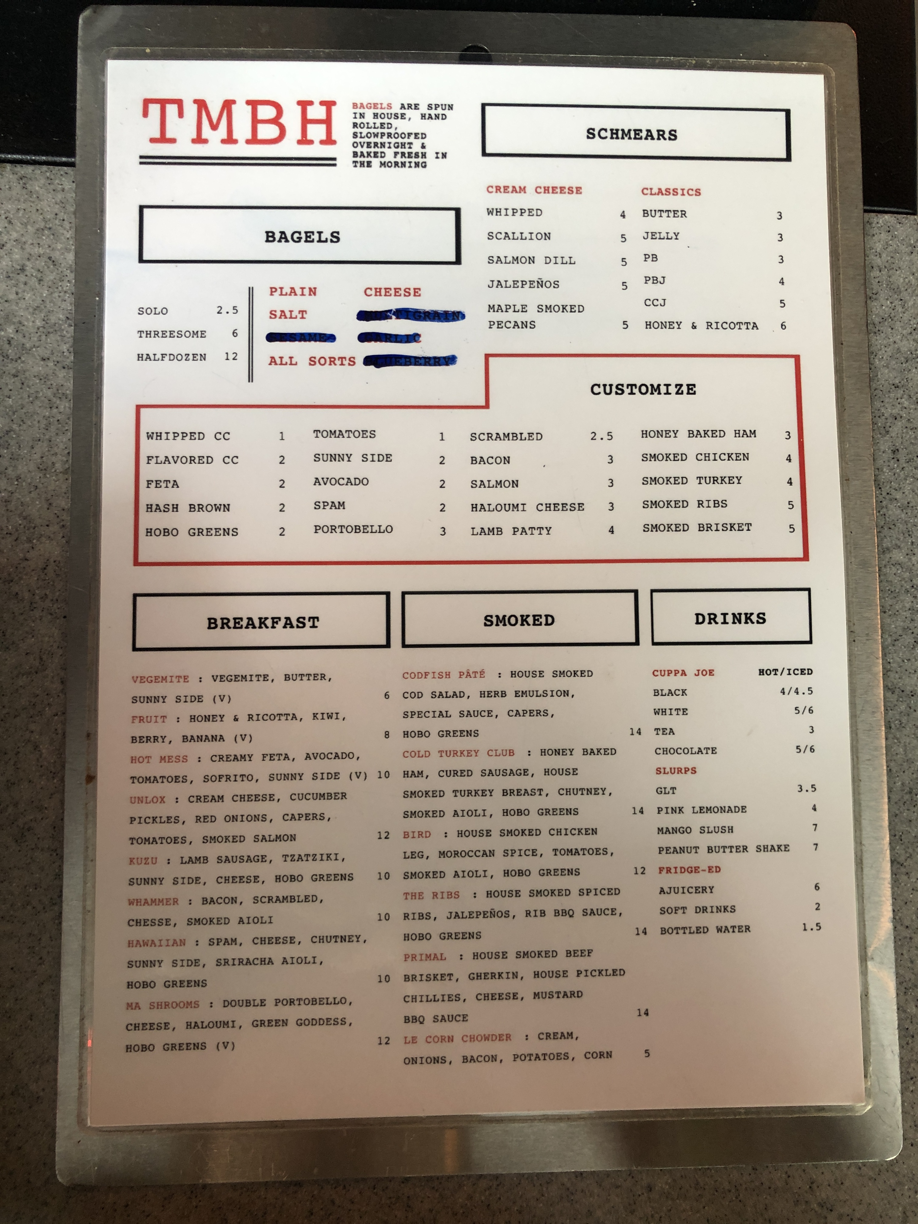 The menu is divided into Breakfast and Smoked bagels, although you can also build your own. Each boasts a mouthwatering combination of proteins, cheese, greens, and sauces, along with your choice of bagel (plain, cheese, salt, or all sorts).