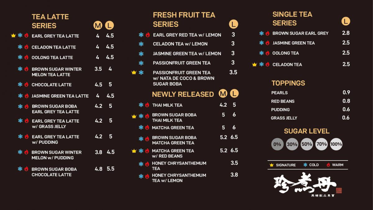 At Truedan, all drinks are sweetened using house-made brown sugar, which you can customise at 30%, 50%, 70%, and 100%. Medium sized drinks can be upsized at a cost of $1.30