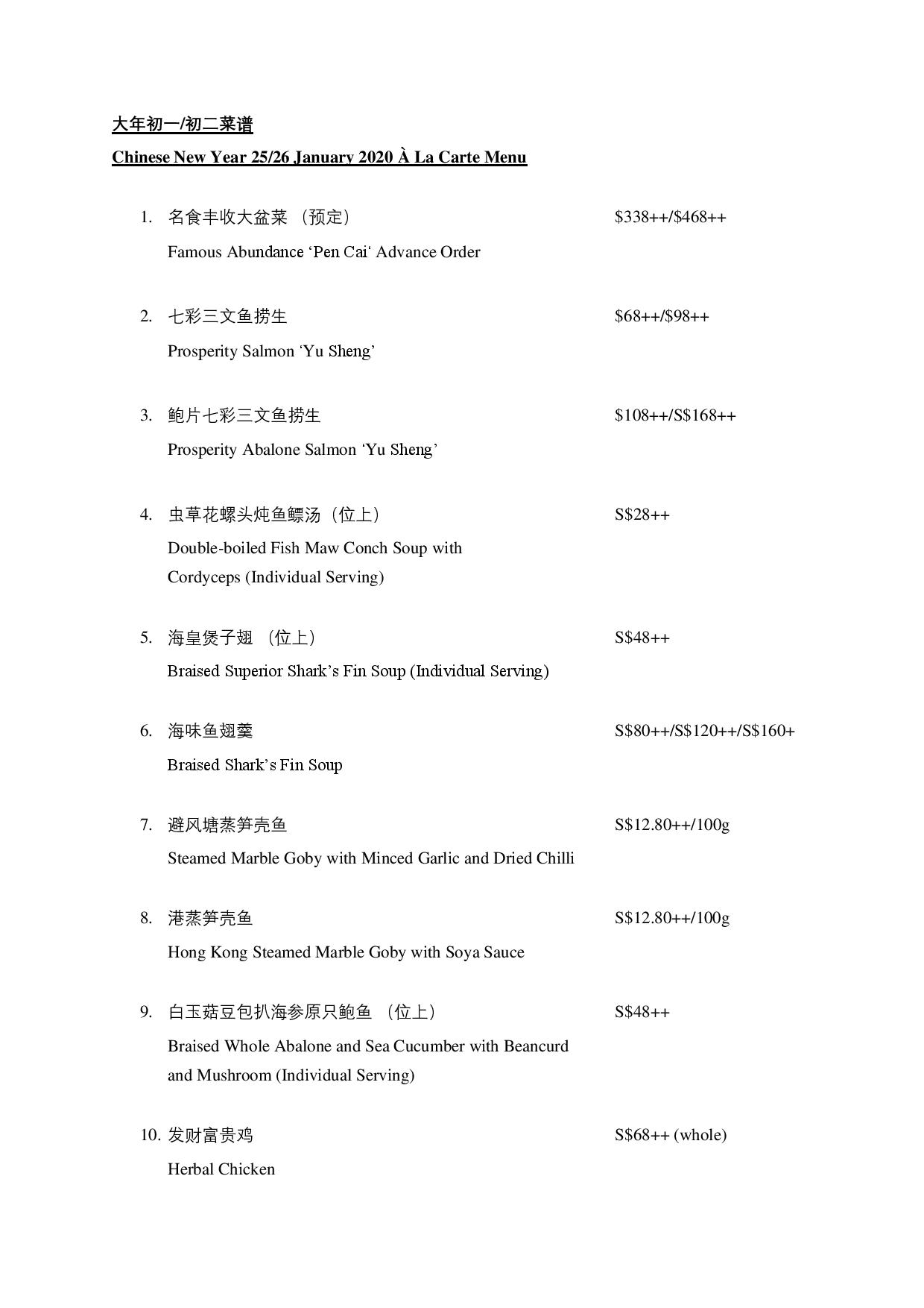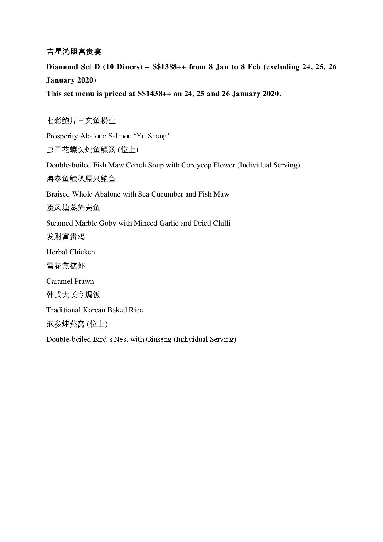 Chinese New Year Set Menus: Sapphire Set A, Jade Set B, Crystal Set C, Diamond Set D